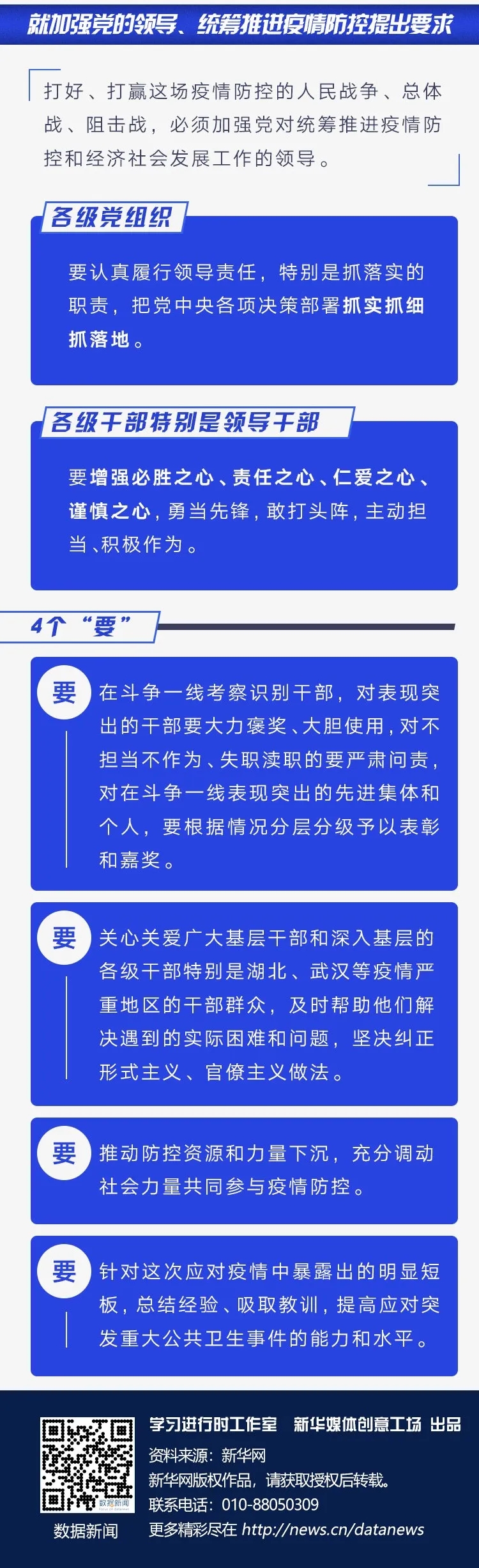 習(xí)近平指出,打好、打贏這場(chǎng)疫情防控的人民戰(zhàn)爭、總體戰(zhàn)、阻擊戰(zhàn),必須加強(qiáng)黨對(duì)統(tǒng)籌推進(jìn)疫情防控和經(jīng)濟(jì)社會(huì)發(fā)展工作的領(lǐng)導(dǎo)。各級(jí)黨組織要認(rèn)真履行領(lǐng)導(dǎo)責(zé)任,特別是抓落實(shí)的職責(zé),把黨中央各項(xiàng)決策部署抓實(shí)抓細(xì)抓落地。各級(jí)干部特別是領(lǐng)導(dǎo)干部要增強(qiáng)必勝之心、責(zé)任之心、仁愛之心、謹(jǐn)慎之心,勇當(dāng)先鋒,敢打頭陣,主動(dòng)擔(dān)當(dāng)、積極作為。要在斗爭一線考察識(shí)別干部,對(duì)表現(xiàn)突出的干部要大力褒獎(jiǎng)、大膽使用,對(duì)不擔(dān)當(dāng)不作為、失職瀆職的要嚴(yán)肅問責(zé),對(duì)在斗爭一線表現(xiàn)突出的先進(jìn)集體和個(gè)人,要根據(jù)情況分層分級(jí)予以表彰和嘉獎(jiǎng)。要關(guān)心關(guān)愛廣大基層干部和深入基層的各級(jí)干部特別是湖北、武漢等疫情嚴(yán)重地區(qū)的干部群眾,及時(shí)幫助他們解決遇到的實(shí)際困難和問題,堅(jiān)決糾正形式主義、官僚主義做法。要推動(dòng)防控資源和力量下沉,充分調(diào)動(dòng)社會(huì)力量共同參與疫情防控。要針對(duì)這次應(yīng)對(duì)疫情中暴露出的明顯短板,總結(jié)經(jīng)驗(yàn)、吸取教訓(xùn),提高應(yīng)對(duì)突發(fā)重大公共衛(wèi)生事件的能力和水平。