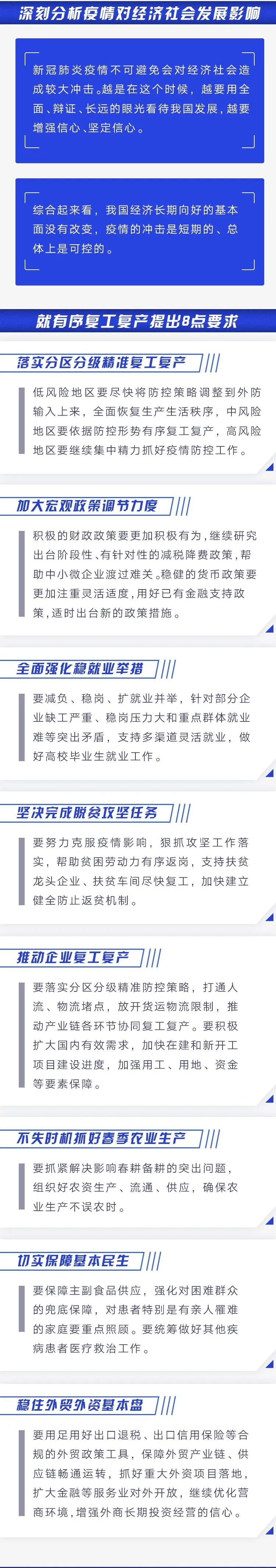 習(xí)近平指出,新冠肺炎疫情不可避免會(huì)對(duì)經(jīng)濟(jì)社會(huì)造成較大沖擊。越是在這個(gè)時(shí)候,越要用全面、辯證、長遠(yuǎn)的眼光看待我國發(fā)展,越要增強(qiáng)信心、堅(jiān)定信心。綜合起來看,我國經(jīng)濟(jì)長期向好的基本面沒有改變,疫情的沖擊是短期的、總體上是可控的。習(xí)近平就有序復(fù)工復(fù)產(chǎn)提出8點(diǎn)要求。第一,落實(shí)分區(qū)分級(jí)精準(zhǔn)復(fù)工復(fù)產(chǎn)。低風(fēng)險(xiǎn)地區(qū)要盡快將防控策略調(diào)整到外防輸入上來,全面恢復(fù)生產(chǎn)生活秩序,中風(fēng)險(xiǎn)地區(qū)要依據(jù)防控形勢(shì)有序復(fù)工復(fù)產(chǎn),高風(fēng)險(xiǎn)地區(qū)要繼續(xù)集中精力抓好疫情防控工作。第二,加大宏觀政策調(diào)節(jié)力度。積極的財(cái)政政策要更加積極有為,繼續(xù)研究出臺(tái)階段性、有針對(duì)性的減稅降費(fèi)政策,幫助中小微企業(yè)渡過難關(guān)。穩(wěn)健的貨幣政策要更加注重靈活適度,用好已有金融支持政策,適時(shí)出臺(tái)新的政策措施。第三,全面強(qiáng)化穩(wěn)就業(yè)舉措。要減負(fù)、穩(wěn)崗、擴(kuò)就業(yè)并舉,針對(duì)部分企業(yè)缺工嚴(yán)重、穩(wěn)崗壓力大和重點(diǎn)群體就業(yè)難等突出矛盾,支持多渠道靈活就業(yè),做好高校畢業(yè)生就業(yè)工作。第四,堅(jiān)決完成脫貧攻堅(jiān)任務(wù)。要努力克服疫情影響,狠抓攻堅(jiān)工作落實(shí),幫助貧困勞動(dòng)力有序返崗,支持扶貧龍頭企業(yè)、扶貧車間盡快復(fù)工,加快建立健全防止返貧機(jī)制。第五,推動(dòng)企業(yè)復(fù)工復(fù)產(chǎn)。要落實(shí)分區(qū)分級(jí)精準(zhǔn)防控策略,打通人流、物流堵點(diǎn),放開貨運(yùn)物流限制,推動(dòng)產(chǎn)業(yè)鏈各環(huán)節(jié)協(xié)同復(fù)工復(fù)產(chǎn)。要積極擴(kuò)大國內(nèi)有效需求,加快在建和新開工項(xiàng)目建設(shè)進(jìn)度,加強(qiáng)用工、用地、資金等要素保障。第六,不失時(shí)機(jī)抓好春季農(nóng)業(yè)生產(chǎn)。要抓緊解決影響春耕備耕的突出問題,組織好農(nóng)資生產(chǎn)、流通、供應(yīng),確保農(nóng)業(yè)生產(chǎn)不誤農(nóng)時(shí)。第七,切實(shí)保障基本民生。要保障主副食品供應(yīng),強(qiáng)化對(duì)困難群眾的兜底保障,對(duì)患者特別是有親人罹難的家庭要重點(diǎn)照顧。要統(tǒng)籌做好其他疾病患者醫(yī)療救治工作。第八,穩(wěn)住外貿(mào)外資基本盤。要用足用好出口退稅、出口信用保險(xiǎn)等合規(guī)的外貿(mào)政策工具,保障外貿(mào)產(chǎn)業(yè)鏈、供應(yīng)鏈暢通運(yùn)轉(zhuǎn),抓好重大外資項(xiàng)目落地,擴(kuò)大金融等服務(wù)業(yè)對(duì)外開放,繼續(xù)優(yōu)化營商環(huán)境,增強(qiáng)外商長期投資經(jīng)營的信心。