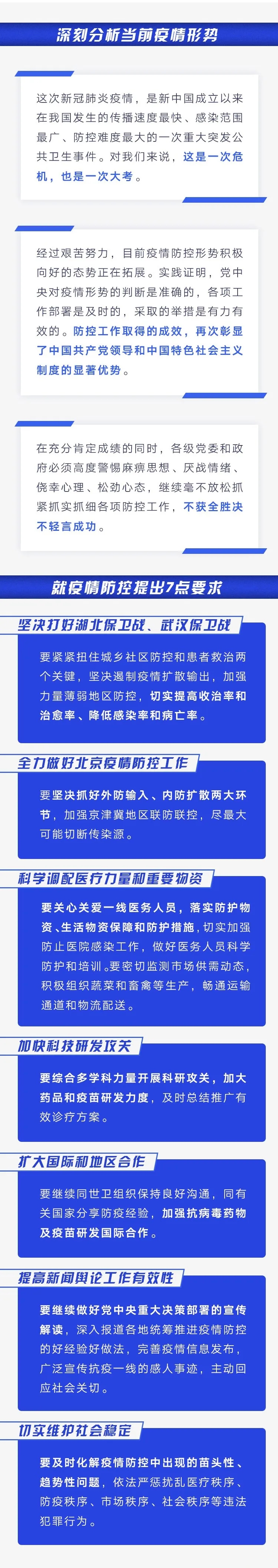 習(xí)近平強(qiáng)調(diào),在充分肯定成績的同時(shí),各級(jí)黨委和政府必須高度警惕麻痹思想、厭戰(zhàn)情緒、僥幸心理、松勁心態(tài),繼續(xù)毫不放松抓緊抓實(shí)抓細(xì)各項(xiàng)防控工作,不獲全勝?zèng)Q不輕言成功。習(xí)近平提出7點(diǎn)要求。第一,堅(jiān)決打好湖北保衛(wèi)戰(zhàn)、武漢保衛(wèi)戰(zhàn)。要緊緊扭住城鄉(xiāng)社區(qū)防控和患者救治兩個(gè)關(guān)鍵,堅(jiān)決遏制疫情擴(kuò)散輸出,加強(qiáng)力量薄弱地區(qū)防控,切實(shí)提高收治率和治愈率、降低感染率和病亡率。第二,全力做好北京疫情防控工作。要堅(jiān)決抓好外防輸入、內(nèi)防擴(kuò)散兩大環(huán)節(jié),加強(qiáng)京津冀地區(qū)聯(lián)防聯(lián)控,盡最大可能切斷傳染源。第三,科學(xué)調(diào)配醫(yī)療力量和重要物資。要關(guān)心關(guān)愛一線醫(yī)務(wù)人員,落實(shí)防護(hù)物資、生活物資保障和防護(hù)措施,切實(shí)加強(qiáng)防止醫(yī)院感染工作,做好醫(yī)務(wù)人員科學(xué)防護(hù)和培訓(xùn)。要密切監(jiān)測(cè)市場(chǎng)供需動(dòng)態(tài),積極組織蔬菜和畜禽等生產(chǎn),暢通運(yùn)輸通道和物流配送。第四,加快科技研發(fā)攻關(guān)。要綜合多學(xué)科力量開展科研攻關(guān),加大藥品和疫苗研發(fā)力度,及時(shí)總結(jié)推廣有效診療方案。第五,擴(kuò)大國際和地區(qū)合作。要繼續(xù)同世衛(wèi)組織保持良好溝通,同有關(guān)國家分享防疫經(jīng)驗(yàn),加強(qiáng)抗病毒藥物及疫苗研發(fā)國際合作。第六,提高新聞?shì)浾摴ぷ饔行?。要繼續(xù)做好黨中央重大決策部署的宣傳解讀,深入報(bào)道各地統(tǒng)籌推進(jìn)疫情防控的好經(jīng)驗(yàn)好做法,完善疫情信息發(fā)布,廣泛宣傳抗疫一線的感人事跡,主動(dòng)回應(yīng)社會(huì)關(guān)切。第七,切實(shí)維護(hù)社會(huì)穩(wěn)定。要及時(shí)化解疫情防控中出現(xiàn)的苗頭性、趨勢(shì)性問題,依法嚴(yán)懲擾亂醫(yī)療秩序、防疫秩序、市場(chǎng)秩序、社會(huì)秩序等違法犯罪行為。