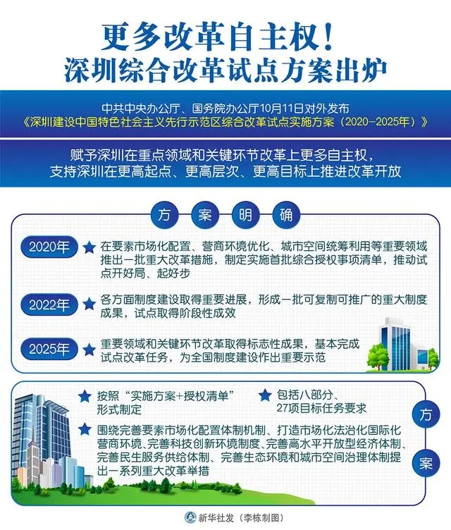 深圳又一次站上新起點(diǎn)。中共中央辦公廳、國務(wù)院辦公廳近日印發(fā)《深圳建設(shè)中國特色社會主義先行示范區(qū)綜合改革試點(diǎn)實(shí)施方案(2020-2025年)》,賦予深圳在重點(diǎn)領(lǐng)域和關(guān)鍵環(huán)節(jié)改革上更多自主權(quán),支持深圳在更高起點(diǎn)、更高層次、更高目標(biāo)上推進(jìn)改革開放。
