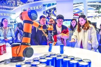 參觀者在北京一場5G大會上控制機械臂抓取飲料,體驗“隔空取物”