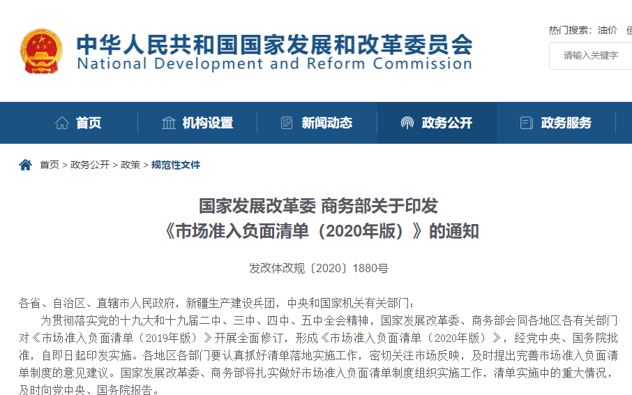 國家發(fā)展改革委新聞發(fā)言人孟瑋表示,從2018年12月正式發(fā)布全國統(tǒng)一的市場準入負面清單以來,通過三年落地實施,已經(jīng)實現(xiàn)了在全國范圍確立了市場準入環(huán)節(jié)的負面清單管理模式。清單之外的行業(yè)、領(lǐng)域、業(yè)務等,市場主體可以依法平等進入,實現(xiàn)“非禁即入”。