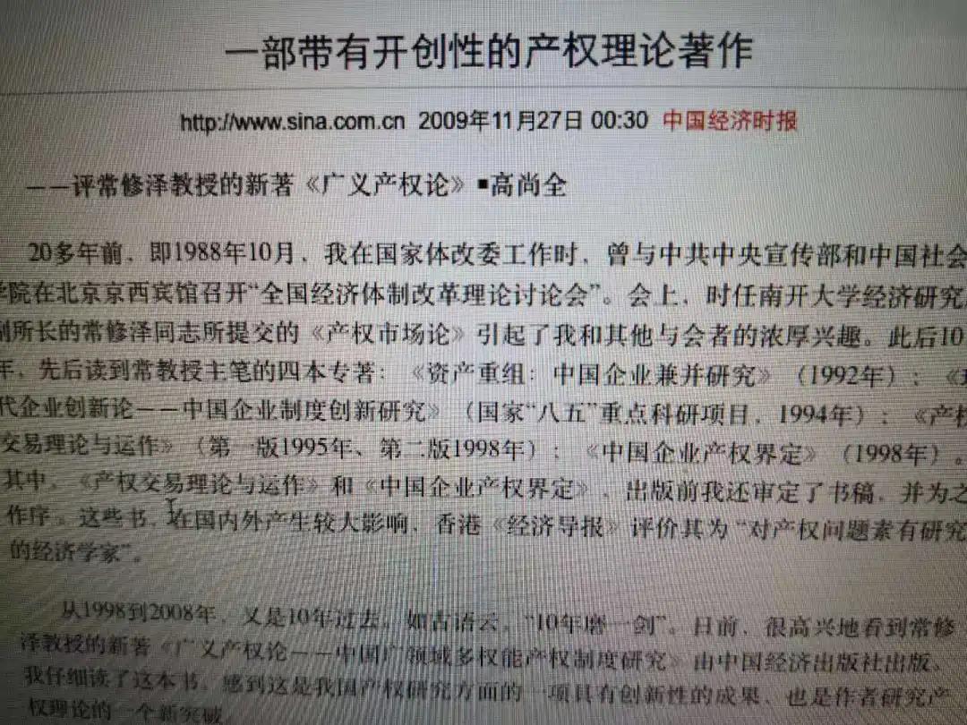 根據(jù)您的指點和林兆木先生等幫助,會后幾年,我從橫向“廣領域產(chǎn)權”(包括“天”——環(huán)境產(chǎn)權、“地”——資源產(chǎn)權、“人”——人本產(chǎn)權)以及縱向“多權能產(chǎn)權”和內(nèi)核“四產(chǎn)權制度”三條線進行拓展、完善。六年后的2009年,我的《廣義產(chǎn)權論》出版。