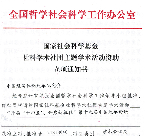 根據(jù)全國哲學(xué)社會科學(xué)工作辦公室發(fā)布的“2021年國家社科基金社科學(xué)術(shù)社團(tuán)主題學(xué)術(shù)活動(dòng)資助名單” ,我會以 “開局‘十四五’、開啟新征程”為主題的第十九屆中國改革論壇獲得國家社科基金立項(xiàng)資助。這是繼今年3月份我會《推進(jìn)土地、勞動(dòng)力、資本、技術(shù)、數(shù)據(jù)等要素市場化改革研究》課題獲得國家社科基金重大項(xiàng)目立項(xiàng)后,兩年內(nèi)第四次獲得國家社科基金資助(獎(jiǎng)勵(lì))。