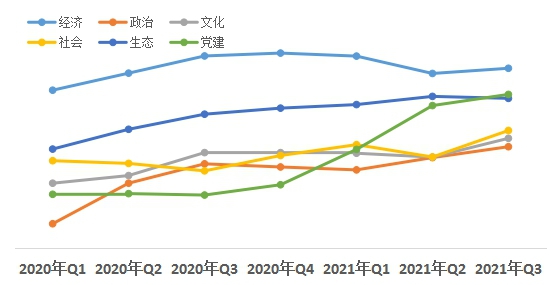 從近幾個季度的評估結(jié)果來看,經(jīng)濟(jì)領(lǐng)域熱度值領(lǐng)先其他領(lǐng)域;黨建領(lǐng)域熱度值從2020年第三季度開始穩(wěn)步上升,且增幅高于文化、社會等領(lǐng)域;政治領(lǐng)域改革熱度值從今年一季度以來持續(xù)呈上升趨勢。