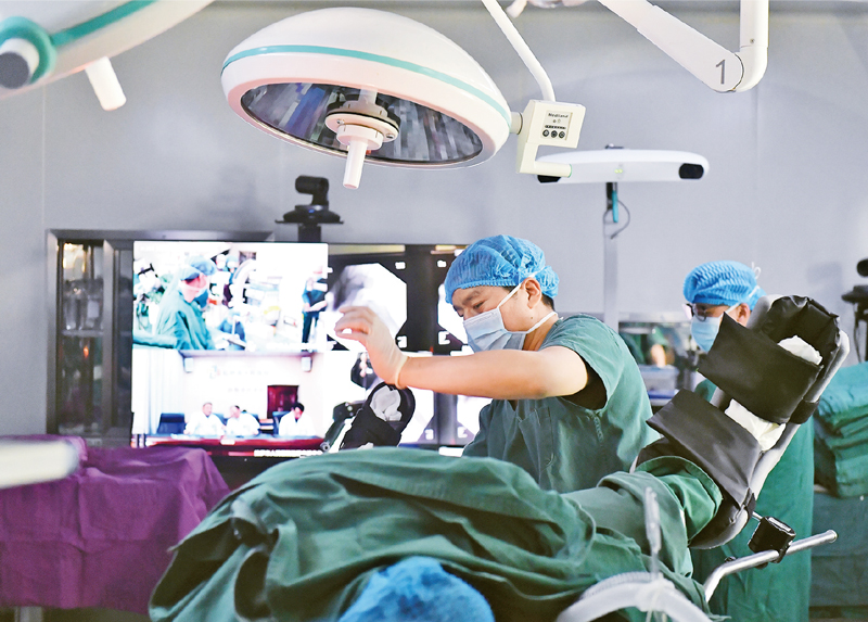 數(shù)字技術與醫(yī)療、農(nóng)業(yè)、能源、建筑、服務業(yè)等緊密結合,正在推動傳統(tǒng)產(chǎn)業(yè)日益高端化、智能化。圖為2021年4月19日,拉薩市人民醫(yī)院骨科醫(yī)生在北京積水潭醫(yī)院專家遠程指導下,使用骨科機器人開展骨科手術?!⌒氯A社記者 孫瑞博 /攝