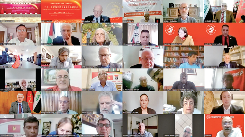 2022年7月28日,中國共產(chǎn)黨與世界馬克思主義政黨論壇舉行。習(xí)近平總書記在賀信中強調(diào),中國共產(chǎn)黨愿同各國馬克思主義政黨加強交流對話,立足本國國情,把準(zhǔn)時代脈搏,不斷豐富和發(fā)展馬克思主義,在攜手推動構(gòu)建人類命運共同體的進程中讓馬克思主義展現(xiàn)出更強大的真理力量。圖為外國政黨代表線上參加論壇。 中共中央對外聯(lián)絡(luò)部供圖