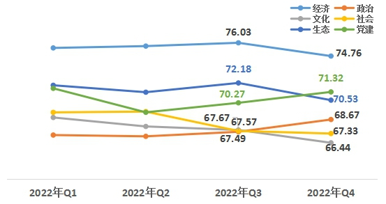 1、政治、黨建領(lǐng)域上升。從六大領(lǐng)域來看,經(jīng)濟領(lǐng)域74.76,政治領(lǐng)域68.67,文化領(lǐng)域66.44,社會領(lǐng)域67.33,生態(tài)領(lǐng)域70.53,黨建領(lǐng)域71.32。與上一季度相比,政治、黨建領(lǐng)域均有上升,經(jīng)濟、文化、社會、生態(tài)領(lǐng)域略有下降。