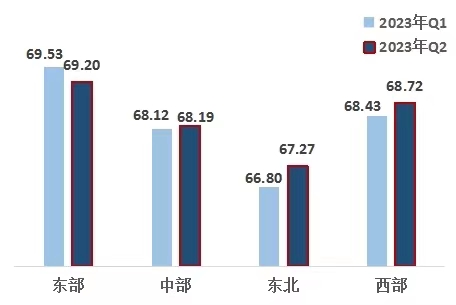 3、東部地區(qū)改革熱度指數下降,西部地區(qū)超越中部地區(qū)。東部、西部、中部、東北地區(qū)指數分別為69.20、68.72、68.19、67.27。東部地區(qū)領先,西部地區(qū)排名第二,且連續(xù)五個季度超越中部地區(qū),東北地區(qū)最后。與上一季度相比,中部、東北、西部地區(qū)改革熱度指數有所上升。