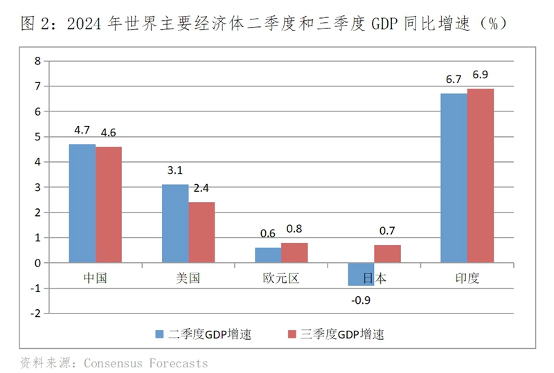 Consensus Forecasts 9月份最新預(yù)測,世界主要經(jīng)濟(jì)體GDP增速有升有落,呈現(xiàn)出走勢分化的特征。三季度美國GDP同比增長2.4%,比二季度增長3.1%回落0.7個(gè)百分點(diǎn);歐元區(qū)增長0.8%,比二季度增長0.6%回升0.2個(gè)百分點(diǎn);日本增長0.7%,二季度下降0.9%,增速由負(fù)轉(zhuǎn)正;印度增長6.9%,比二季度增長6.7%回升0.2個(gè)百分點(diǎn)。