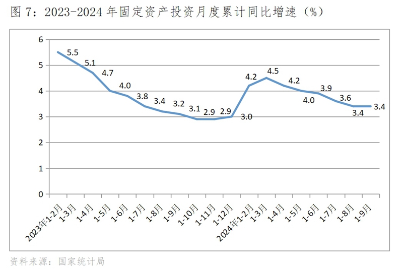 (二)投資增速持續(xù)回落更為明顯,9月份保持穩(wěn)定。1-2月份固定資產(chǎn)投資同比增長4.2%,1-3月份增速回升到今年以來的最高增速的4.5%,自此以后持續(xù)回落,到8月份回落到3.4%,9月份保持穩(wěn)定,與8月份增速持平。