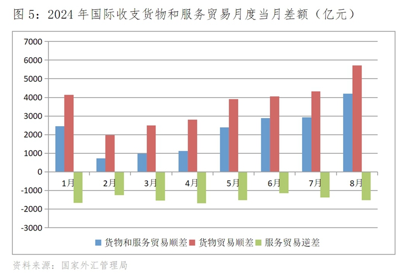 (四)國際收支貨物和服務(wù)貿(mào)易順差總體逐月增加,貨物貿(mào)易順差的增加是主因。1月份,國際收支貨物和服務(wù)貿(mào)易順差實(shí)現(xiàn)了高開,達(dá)到了2459億元,2月份回落到724億元,但從2月份開始國際收支貨物和服務(wù)貿(mào)易順差逐月增加, 8月份達(dá)4203億元,比2月份增加了3479億元。