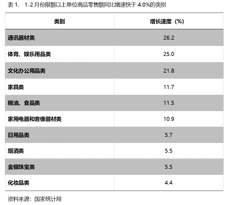 1-2月份,限額以上單位商品零售額增速快于社會消費(fèi)品零售總額4.0%增速的共有10類,即通訊器材類增長26.2%,體育、娛樂用品類增長25.0%,文化辦公用品類增長21.8%,家具類增長11.7%,糧油、食品類增長11.5%,家用電器和音像器材類增長10.9%,日用品類增長5.7%,煙酒類增長5.5%,金銀珠寶類增長5.5%,化妝品類同比增長4.4%。