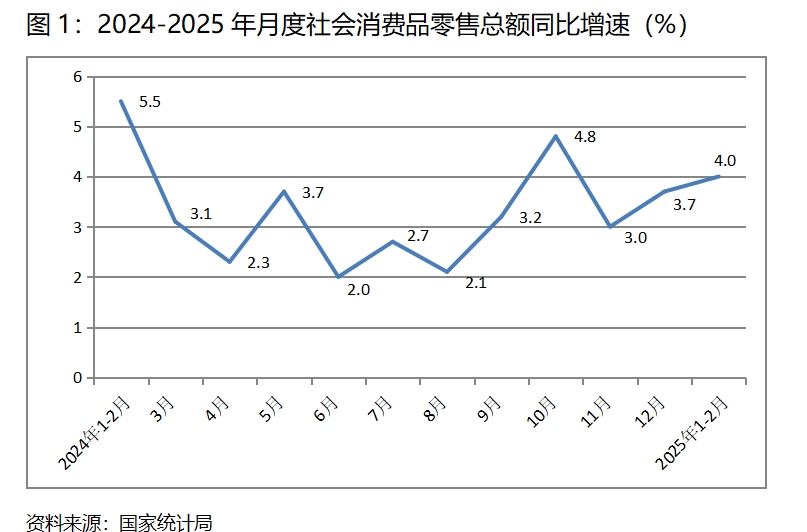(一)零售增速繼續(xù)回升。1-2月份,社會消費(fèi)品零售總額同比增長4.0%,比上年12月份增長3.7%回升了0.3個(gè)百分點(diǎn),上年12月份比上年11月份增長3.0%回升了0.7個(gè)百分點(diǎn)。數(shù)據(jù)顯示,社會消費(fèi)品零售總額保持了持續(xù)回升的勢頭,這是上年以來采取的以舊換新等系列促進(jìn)消費(fèi)政策措施的結(jié)果,特別需要指出的是,這一增速是在上年同期基數(shù)較高基礎(chǔ)上的回升,更加說明消費(fèi)增長的動力在增強(qiáng)。