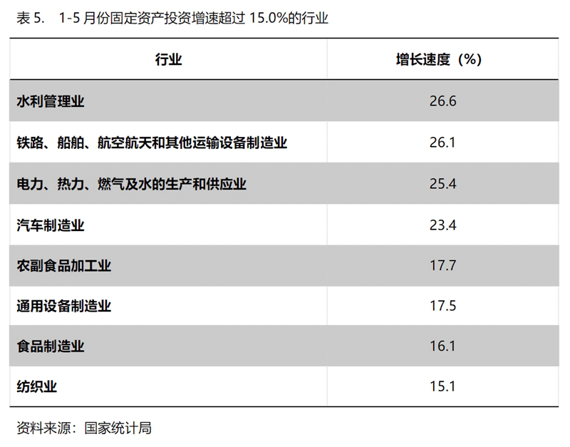1-5月份,固定資產(chǎn)投資增速超過15%的主要行業(yè)共8個,即水利管理業(yè)增長26.6%,鐵路、船舶、航空航天和其他運輸設(shè)備制造業(yè)增長26.1%,電力、熱力、燃氣及水的生產(chǎn)和供應(yīng)業(yè)增長25.4%,汽車制造業(yè)增長23.4%,農(nóng)副食品加工業(yè)增長17.7%,通用設(shè)備制造業(yè)增長17.5%,食品制造業(yè)增長16.1%,紡織業(yè)增長15.1%。