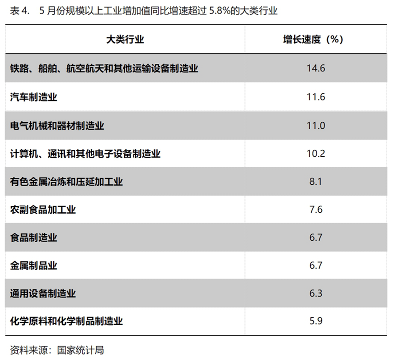 5月份,增長速度超過規(guī)模以上工業(yè)增長5.8%的主要大類行業(yè)共有10個,即鐵路、船舶、航空航天和其他運輸設(shè)備制造業(yè)增長14.6%,汽車制造業(yè)增長11.6%,電氣機械和器材制造業(yè)增長11.0%,計算機、通訊和其他電子設(shè)備制造業(yè)增長10.2%,有色金屬冶煉和壓延加工業(yè)增長8.1%,農(nóng)副食品加工業(yè)增長7.6%,食品制造業(yè)增長6.7%,金屬制品業(yè)增長6.7%,通用設(shè)備制造業(yè)增長6.3%,化學(xué)原料和化學(xué)制品制造業(yè)增長5.9%。