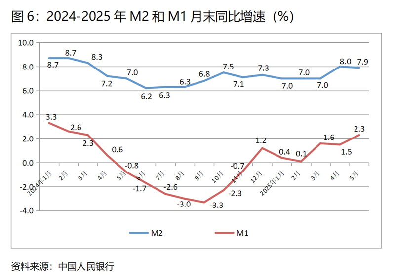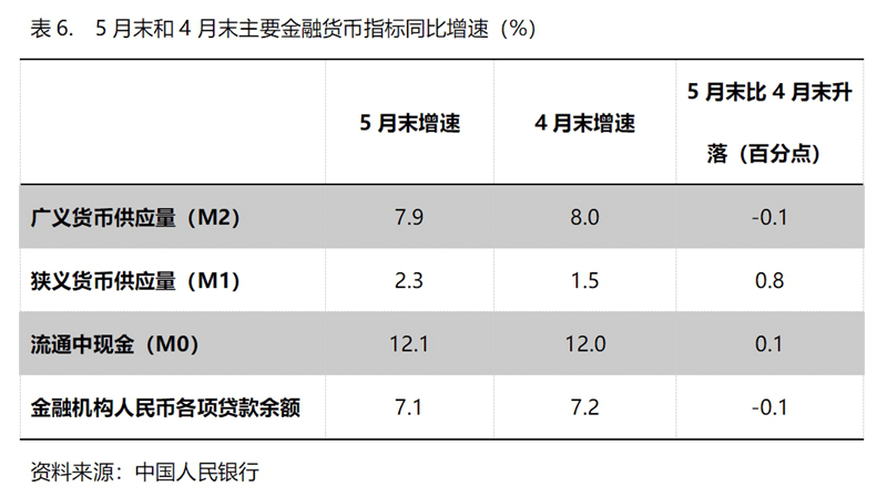 (六)M2增速由升轉(zhuǎn)落。5月末,廣義貨幣供應(yīng)量(M2)同比增長7.9%,比4月末增長8.0%回落0.1個百分點,基本保持了上月末的增速;狹義貨幣供應(yīng)量(M1)增速比上月有所回升,5月末同比增長2.3%,比4月末增長1.5%回升0.8個百分點,而4月末增幅比3月末增幅回落0.1個百分點;流通中貨幣(M0)增速持續(xù)回升,5月末同比增長12.1%,比4月末增長12.0%回升0.1個百分點,而4月末增速比3月末增速回升0.5個百分點。5月末M2增速與上月增速基本持平,M1和M0增速回升,表明貨幣政策仍在向適度寬松方向的要求運行,但需要關(guān)注的還是M1增速仍還比較緩慢。