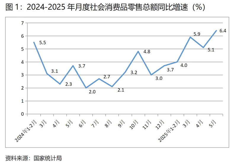 (一)零售增速由落轉(zhuǎn)升。5月份,社會消費品零售總額同比增長6.4%,比4月份增長5.1%回升了1.3個百分點,4月份比3月份增長5.8%回落了0.7個百分點,社會消費品零售總額增速由上月回落轉(zhuǎn)為回升,為上年以來月度同比增速最快的月份。這是近一個時期特別是今年以來持續(xù)采取以舊換新等一系列擴大消費政策措施的結(jié)果,同時也說明只要采取積極有效的政策措施,是能夠取得一些領(lǐng)域持續(xù)回升的效果。