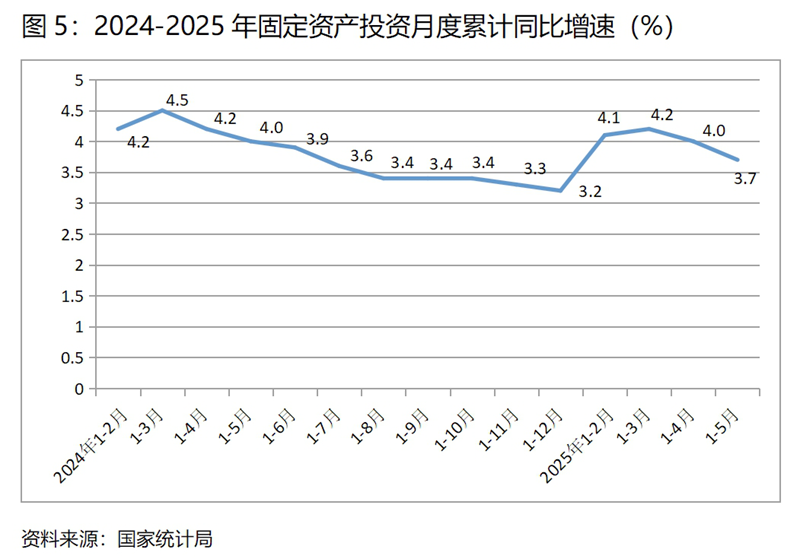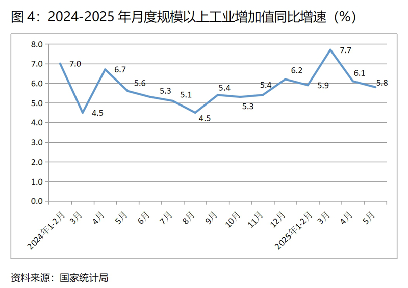 (四)工業(yè)增速持續(xù)回落。5月份,規(guī)模以上工業(yè)增加值同比增長5.8%,比上月增長6.1%回落了0.3個百分點,4月份比3月份回落了1.6個百分點,呈現(xiàn)出兩個月的連續(xù)回落。從工業(yè)三大門類看,主要是制造業(yè)增速回落。5月份采礦業(yè)同比增長5.7%,與上月持平;制造業(yè)增長6.2%,比上月回落0.4個百分點;電力、熱力、燃氣及水生產(chǎn)和供應(yīng)業(yè)增長2.2%,比上月回升0.1個百分點。5月份工業(yè)增速回落幅度雖然比上月收窄不少,但還是要密切關(guān)注回落背后反映出的工業(yè)增長動力未來可能變動的趨勢。
