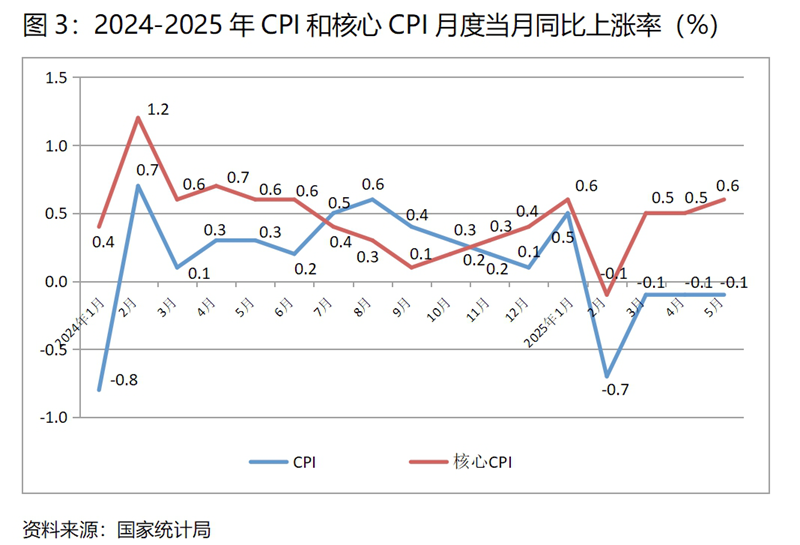 (三) CPI降幅持續(xù)持平。5月份,CPI同比下降0.1%,與4月份下降0.1%持平, CPI已連續(xù)4個月下降,連續(xù)3個月保持下降0.1%;5月份,核心CPI同比上漲0.6%,比4月份上漲0.5%上升了0.1個百分點。CPI保持持續(xù)下降的趨勢,有季節(jié)性食品和國際石油價格下降因素的影響,但核心CPI漲幅仍保持在低位運行,說明需求特別是消費需求仍還較為偏弱,擴大需求特別是消費需求還需要進一步加大力度。