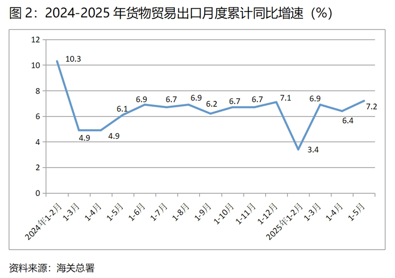 (二)貨物出口增速由落轉(zhuǎn)升。1-5月份,貨物出口同比增長7.2%,比1-4月份增長6.4%回升0.8個百分點,1-4月份比1-3月份回落0.5個百分點,增速呈現(xiàn)出由落轉(zhuǎn)升的態(tài)勢。貨物出口對主要貿(mào)易出口經(jīng)濟體增速有升有落,1-5月份對歐盟出口同比增長7.7%,比1-4月份4.9%增速回升2.8個百分點;對美國出口下降8.7%,比1-4月份下降2.5%擴大6.2個百分點;對東盟出口增長13.5%,比1-4月份11.5%增速回升2.0個百分點;對拉丁美洲出口增長10.6%,比1-4月份11.5%增速回落0.9個百分點。盡管5月12日中美發(fā)表聯(lián)合公報同意在90天內(nèi)暫時調(diào)降“對等關(guān)稅”中的稅率,但我國對美出口降幅仍出現(xiàn)進一步擴大的趨勢,與整個出口增長加快形成了明顯反差,說明中美貿(mào)易關(guān)系的復(fù)雜性和較大的不確定性。
