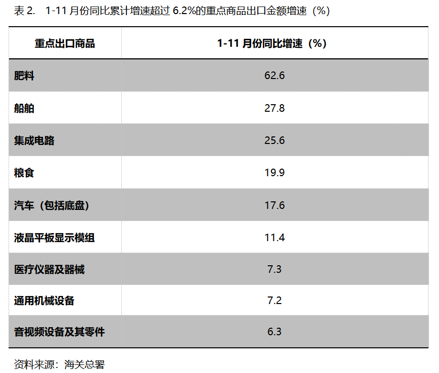 1-11月份,出口金額同比增速超過(guò)6.2%的重點(diǎn)商品共有9類,即肥料出口增長(zhǎng)62.6%,船舶增長(zhǎng)27.8%,集成電路增長(zhǎng)25.6%,糧食增長(zhǎng)19.9%,汽車(包括底盤)增長(zhǎng)17.6%,液晶平板顯示模組增長(zhǎng)11.4%,醫(yī)療儀器及器械增長(zhǎng)7.3%,通用機(jī)器設(shè)備增長(zhǎng)7.2%,音視頻設(shè)備及其零件增長(zhǎng)6.3%。