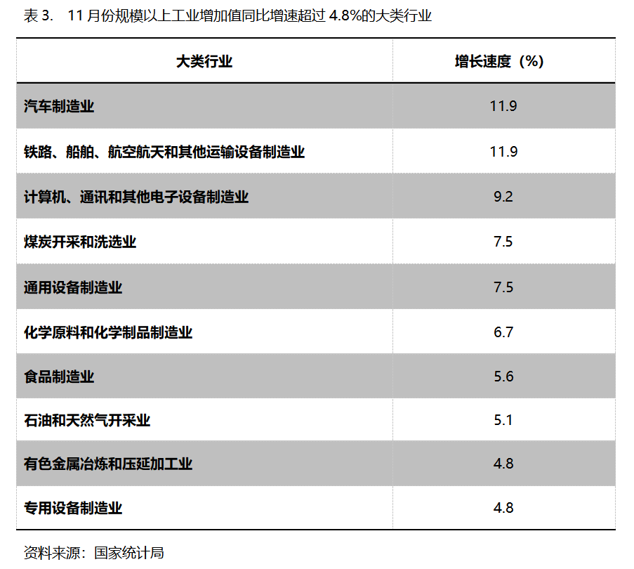 11月份,增長(zhǎng)速度超過(guò)或持平規(guī)模以上工業(yè)增長(zhǎng)4.8%的主要大類行業(yè)共有10個(gè),即汽車制造業(yè)同比增長(zhǎng)11.9%,鐵路、船舶、航空航天和其他運(yùn)輸設(shè)備制造業(yè)增長(zhǎng)11.9%,計(jì)算機(jī)、通訊和其他電子設(shè)備制造業(yè)增長(zhǎng)9.2%,煤炭開采和洗選業(yè)增長(zhǎng)7.5%,通用設(shè)備制造業(yè)增長(zhǎng)7.5%,化學(xué)原料和化學(xué)制品制造業(yè)增長(zhǎng)6.7%,食品制造業(yè)增長(zhǎng)5.6%,石油和天然氣開采業(yè)增長(zhǎng)5.1%,有色金屬冶煉和壓延加工業(yè)增長(zhǎng)4.8%,專用設(shè)備制造業(yè)增長(zhǎng)4.8%。