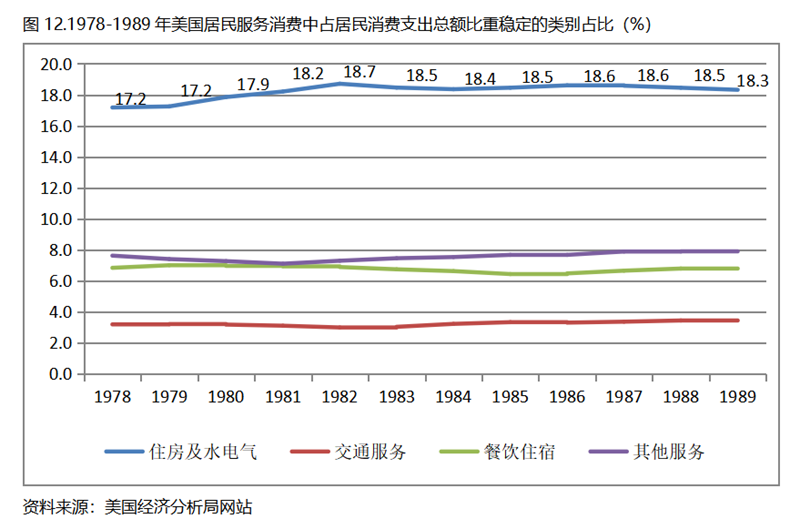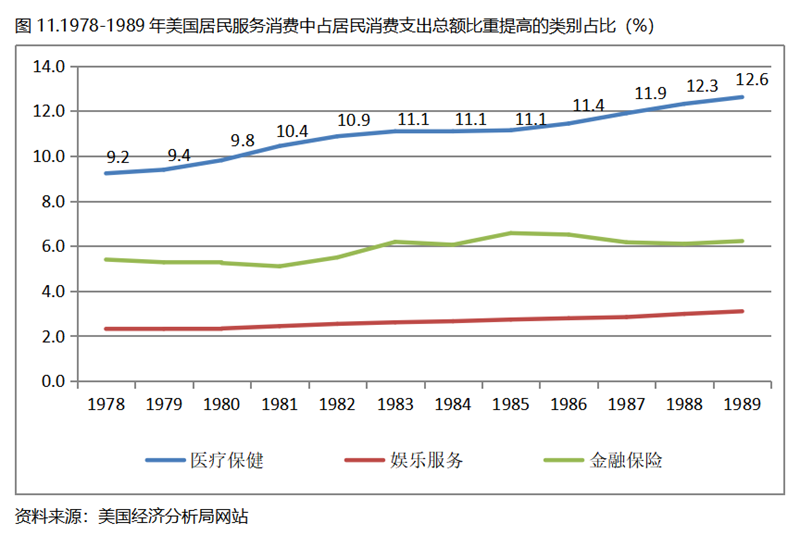 由于數(shù)據(jù)來源的原因,重點將看一下美國居民服務消費類別在人均GDP超過1萬美元后的變化情況。美國居民服務消費共有7個大類別,在1978-1989年期間占居民消費支出總額比重提高的有3個類別,分別是醫(yī)療保健、娛樂服務和金融保險,醫(yī)療保健占居民消費支出總額的比重提高了3.4個百分點,娛樂服務和金融保險占居民消費支出總額的比重均提高了0.8個百分點。