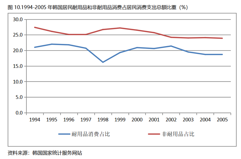 韓國在人均GDP超過1萬美元后的1994-2005年期間,居民服務消費占居民消費支出總額在波動中提高,而居民耐用品消費占居民消費支出總額比重、非耐用品消費占居民消費支出總額比重要均呈現(xiàn)下降趨勢。