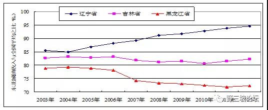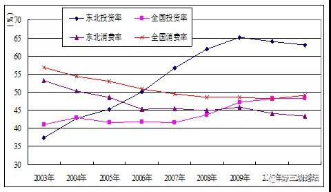 我們可以看看,從2003年到2012年這十年,實際上東北很多問題并沒有真正解決,比如投資率、消費率比嚴(yán)重扭曲,東北比全國要嚴(yán)重的多。三省投資率由2003年的37.3%上升至2011年的63.1%,提高了25.8個百分點,而同期全國由41%增長到48.3%,提高了7.3個百分點;消費率由53.2%下降至43.2%,降低10個百分點,而同期全國由56.9%下降至49.1%,降低7.8個百分點。全國的投資率已經(jīng)過高了,東北的投資消費比例更加扭曲。