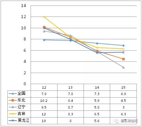 另外有一個數(shù)字,我希望經(jīng)濟學(xué)家們進一步分析。近兩年東北居民消費水平增長率和東北的GDP下降是反向的。遼寧是“斷崖式”的GDP下降,但居民消費增長率2012年-2015年一直高于全國平均水平。
