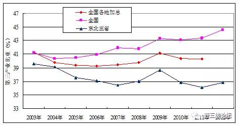 2003年到2012年,第三產(chǎn)業(yè)的比重與全國相比,東北地區(qū)差距進一步拉大。