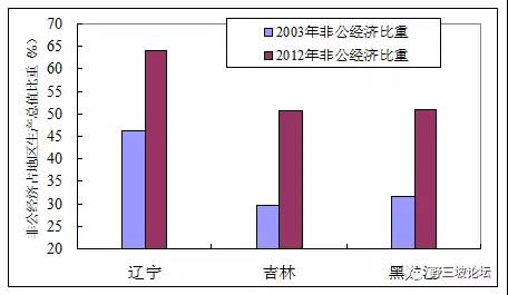 這里對民營經(jīng)濟發(fā)展和國企改革多說一兩句。2003年,東北國企所占的比重很高,有的省占到70%,到2012年遼、吉、黑三省非公經(jīng)濟比重分別達到64%、50.8%和51%。