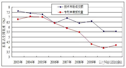 2011年,遼、吉、黑三省R&D經(jīng)費支出分別占地區(qū)生產(chǎn)總值的1.52%、1.23%和1.02%,均低于全國1.84%的平均值,占全國比重由2003年的9.16%下降到2011年的7.1%。