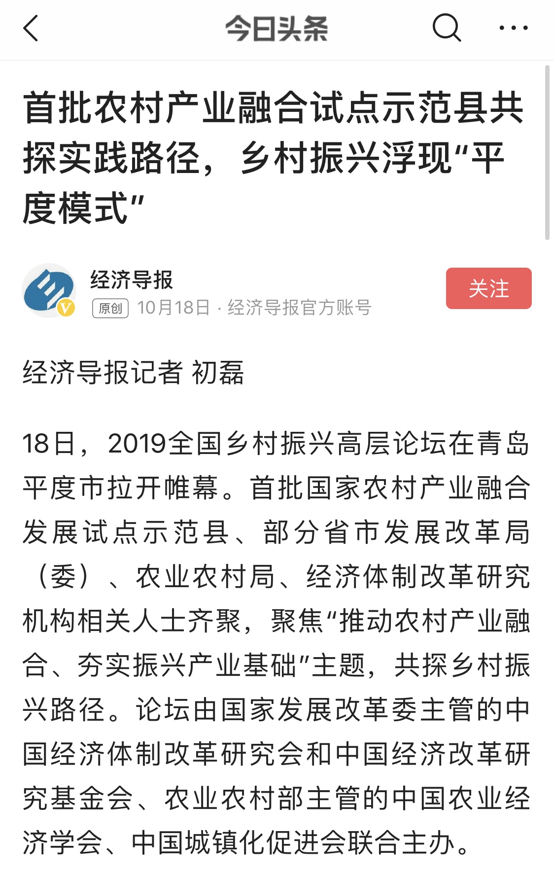 10月18日,中國(guó)經(jīng)濟(jì)體制改革研究會(huì)、中國(guó)農(nóng)業(yè)經(jīng)濟(jì)學(xué)會(huì)、中國(guó)經(jīng)濟(jì)改革研究基金會(huì)、中國(guó)城鎮(zhèn)化促進(jìn)會(huì)聯(lián)合主辦的2019全國(guó)鄉(xiāng)村振興高層論壇在平度市開(kāi)幕,開(kāi)啟了以“推動(dòng)農(nóng)村產(chǎn)業(yè)融合 夯實(shí)振興產(chǎn)業(yè)基礎(chǔ)”為主題的大討論。論壇上,中國(guó)經(jīng)濟(jì)體制改革研究會(huì)宣布把平度市列為博士后科研工作站調(diào)研基地,并授予平度“中國(guó)經(jīng)濟(jì)體制改革研究會(huì)博士后科研工作站調(diào)研基地”標(biāo)牌。